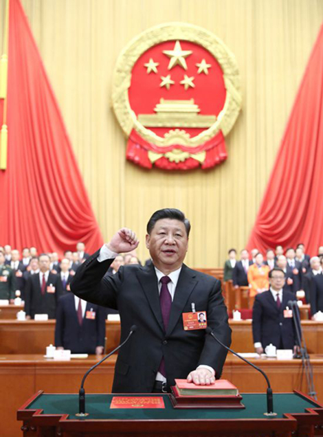 在十三屆全國人大一次會議第五次全體會議上,習近平左手撫按憲法,右手舉拳,面向近3000名代表宣讀誓詞。