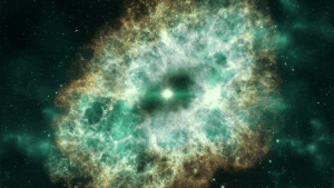 這些元素是在超新星爆炸過程中排出的。爆炸後的恆星剩下的超密集核心,作為一顆快速旋轉的中子星留在蟹狀星雲的中心。電子以近乎光速的速度圍繞着恆星的磁場線旋轉,在星雲的內部產生了陰森的藍光。