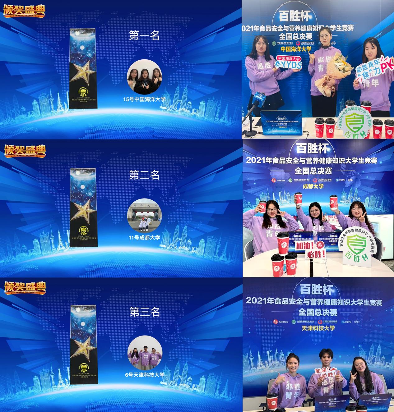 12月5日,2021年“百勝杯”食品安全知識進大學校園活動總決賽完美收官,經過激烈角逐,中國海洋大學代表隊脱穎而出獲得全國總冠軍。總決賽以線上線下相結合方式開展,分別來自內蒙古、浙江等省區市的16支分站賽高校冠軍隊伍通過線上競賽系統與北京主會場連線,活動全程在中國市場監管報抖音號進行直播。