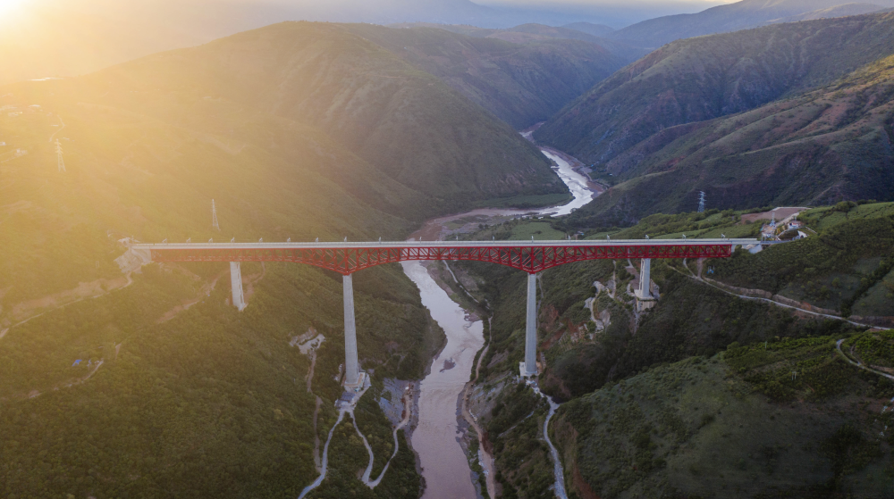 紅色鋼桁梁飛架在灰白的橋墩上,遠處望去,跨越元江的中老鐵路元江特大橋在羣山間顯得格外壯美。