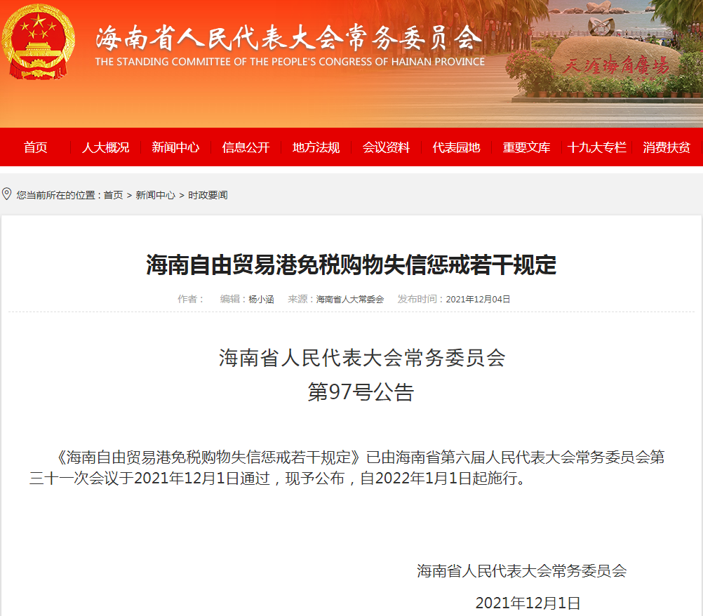 為貫徹落實《中華人民共和國海南自由貿易港法》關於“加強社會信用體系建設和應用,構建守信激勵和失信懲戒機制”的有關要求,引導誠信守法消費,保障海南自貿港政策有序運行,2021年12月1日海南省六屆人大常委會第三十一次會議審議通過《海南自由貿易港免税購物失信懲戒若干規定》(以下簡稱《若干規定》),共十條,自2022年1月1日起施行。