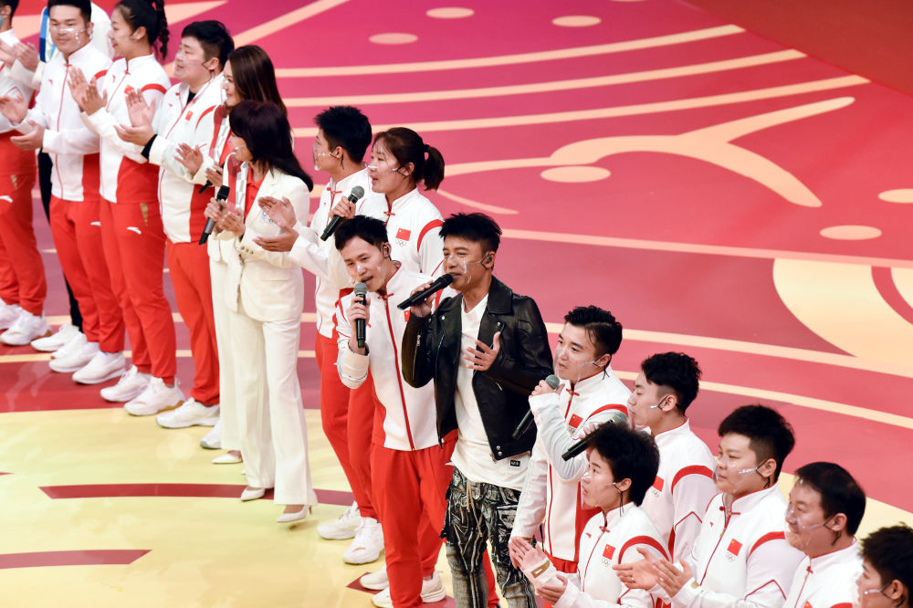 香港歌手李克勤(中)與內地奧運健兒代表團成員一起演唱。新華社記者盧炳輝攝