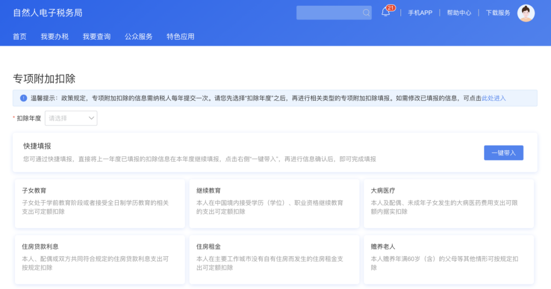 在此記者也提醒大家,即使信息沒有變化,建議大家最好還是核對下自己的信息是否填寫正確。為啥沒有變化還要確認?因為目前並沒有通知説會自動順延,最好還是點一下“一鍵帶入”。而且,系統在不斷升級的過程中進行了調整、用户本身信息變化或之前申報時信息填寫錯誤,很可能會造成之後的信息失效、不符合扣除條件、單位無法下載等問題。