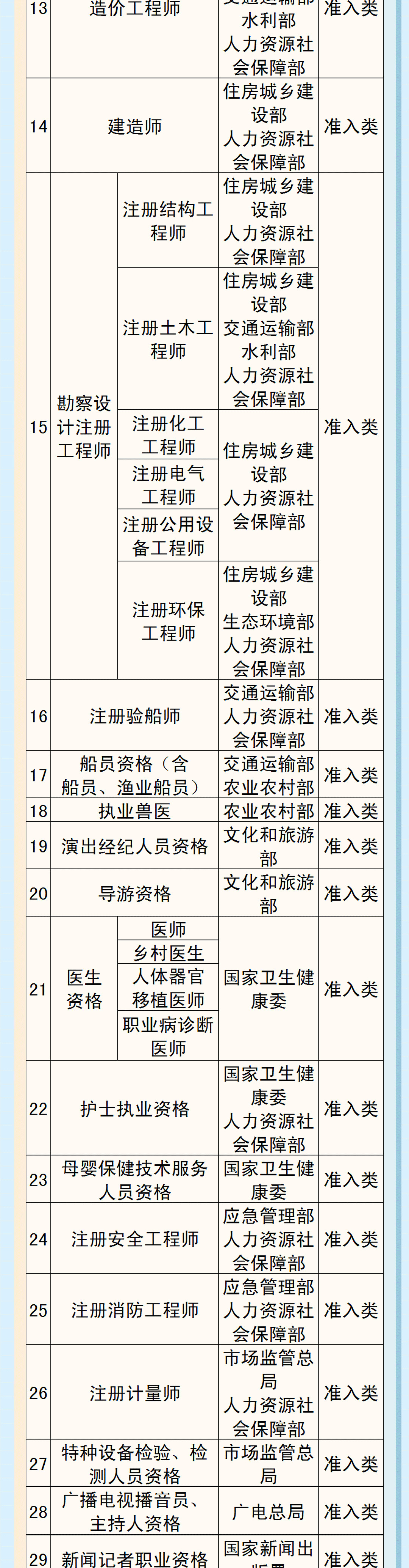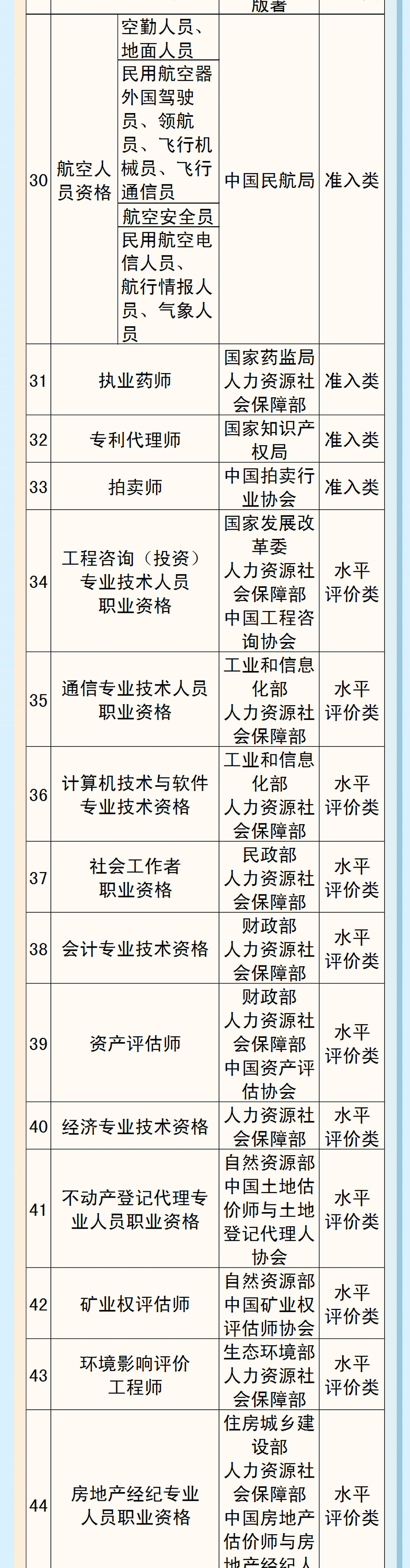 在專業技術人員職業資格方面 ,“出入境檢疫處理人員資格”、“鄉村獸醫資格”和勘察設計註冊工程師下的“註冊石油天然氣工程師”“註冊冶金工程師”“註冊採礦/礦物工程師”“註冊機械工程師”退出目錄,從業人員依據行業標準開展技術活動。