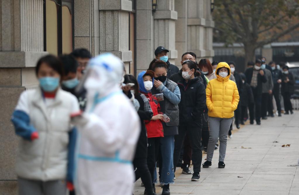 11月17日,大連市玉華社區居民在核酸檢測點外排隊等候核酸採樣。新華社記者姚劍鋒 攝