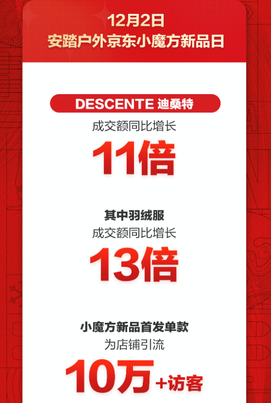 在安踏户外京東小魔方新品日,擁有悠久滑雪基因的高端專業運動品牌迪桑特借勢冬奧會即將舉辦的熱度,創下銷量新高,成交額同比增長11倍,其中羽絨服成交額更是同比增長13倍。迪桑特還發布了以陳偉霆、吳彥祖等明星同款專業滑雪服為代表的小魔方新品首發單款,為店鋪引流10萬+訪客。
