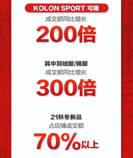 由明星陳坤代言的可隆,是來自於韓國的高端品質户外生活方式品牌,同樣深受消費者追捧。在此次安踏户外京東小魔方新品日,成交額同比增長200倍,其中羽絨服/棉服成交額同比增長300倍。值得一提的是,可隆21秋冬新品佔店鋪成交額70%以上。