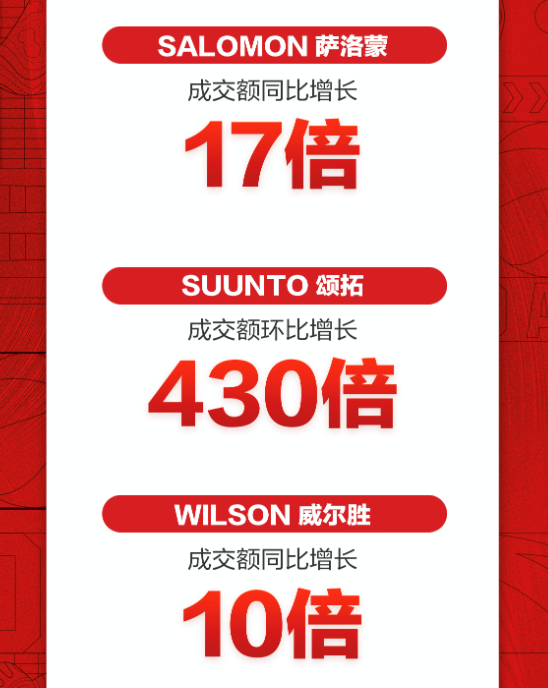 此外,薩洛蒙、頌拓、威爾勝等品牌也在此次活動中大放異彩。薩洛蒙成交額同比增長17倍,頌拓成交額環比增長430倍,威爾勝成交額同比增長10倍。