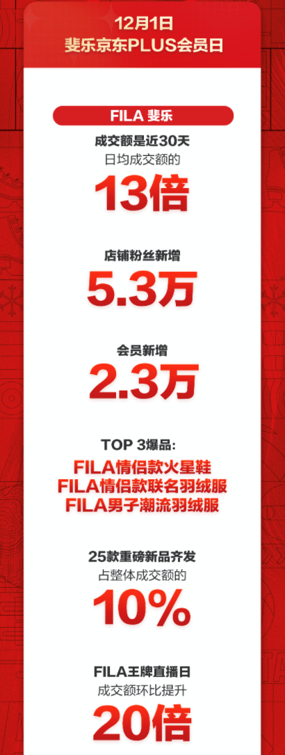 在斐樂京東PLUS會員日,FILA品牌成交額是近30天日均成交額的13倍,店鋪粉絲新增5.3萬,會員新增2.3萬。FILA王牌直播日成交額環比提升20倍。在最受消費者歡迎的產品中,FILA情侶款火星鞋、FILA情侶款聯名羽絨服、FILA男子潮流羽絨服佔據爆品TOP 3。