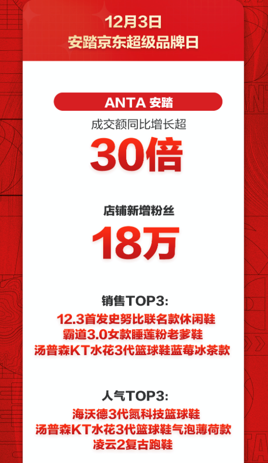 京東X安踏集團超品日數據:品牌成交額同比增長超30倍