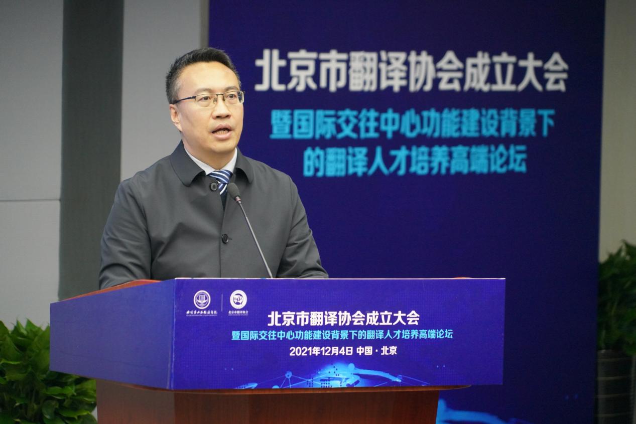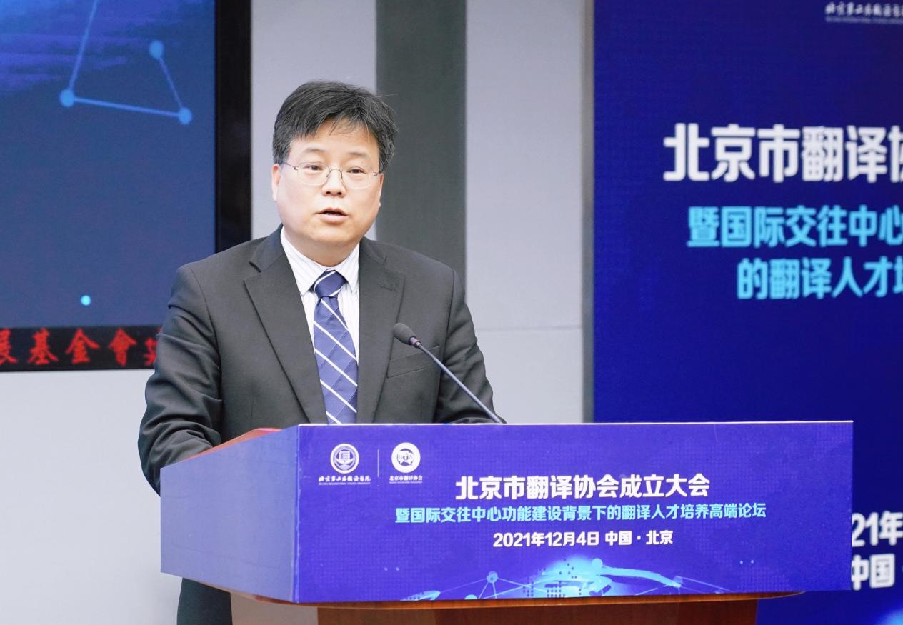 12月4日下午,北京市翻譯協會成立大會在北京第二外國語學院舉行,這是北京市目前唯一翻譯領域的學術性非營利性社會團體。中國翻譯協會常務副會長黃友義,北京第二外國語學院黨委書記顧曉園,北京第二外國語學院黨委副書記、校長計金標,北京市委宣傳部副部長、市政府新聞辦公室主任徐和建,北京市委外辦、市政府外辦黨組成員、副主任李軼,北京市社科聯副主席、社科規劃辦副主任楊志俊,北京市人民對外友好協會副會長劉玉虹,當代中國與世界研究院黨委書記、中國翻譯協會副秘書長楊平,北京第二外國語學院黨委常委、副校長程維、鄭承軍,北京大學黨委組織部部長、外國語學院院長寧琦等出席會議。在京與翻譯相關的高校、科研院所、機關企事業單位等專家學者近70人作為創始會員,通過線上或線下形式參加會議。