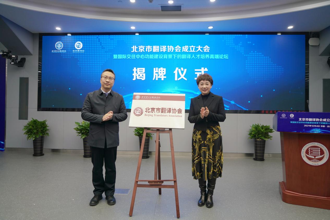 成立大會的最後,北京第二外國語學院黨委書記顧曉園,北京市社科聯副主席、社科規劃辦副主任楊志俊共同為協會揭牌。