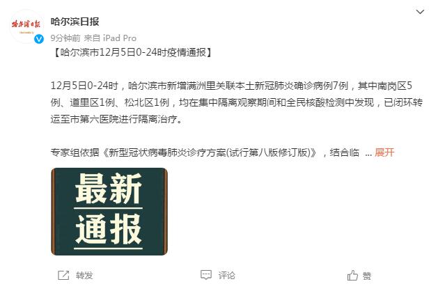 12月5日0-24時,哈爾濱市新增滿洲里關聯本土新冠肺炎確診病例7例,其中南崗區5例、道里區1例、松北區1例,均在集中隔離觀察期間和全民核酸檢測中發現,已閉環轉運至市第六醫院進行隔離治療。