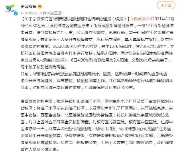 【關於寧波鎮海區3例新冠核酸檢測陽性結果的通報(續報)】#權威發佈#2021年12月5日16:30左右,接到鎮海區龍賽醫療集團例行核酸採樣檢測報告,一份1:10混採檢測結果異常。接到首檢報告後,市、區兩級立即響應、迅速行動,第一時間將10名採樣對象隔離觀察,並組織專業人員開展疫情核實、流行病學調查、單人單管標本複檢,落實各項疫情防控措施。5日20:30區疾控中心檢測,其中1人初篩陽性,其餘9人均為陰性,立即對該初篩陽性感染者排查樣本進行復核,結果為陽性。同時對該初篩陽性感染者同住家庭成員4人緊急排查採樣,6日4:00核酸檢測結果為2人陽性,分別為其母親和妻子,兩個孩子核酸檢測為陰性。
