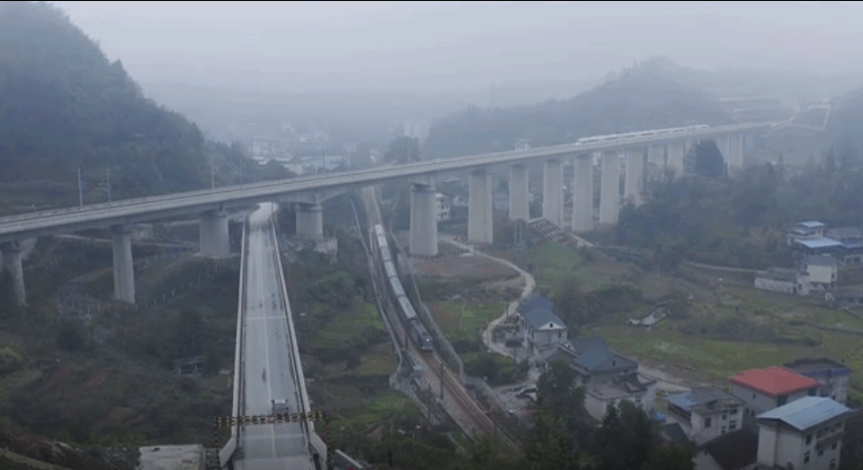 同時,沿線車站結合當地特色文化元素,做到“一站一景”。如吉首東站的外觀就像流動的山水,鳳凰古城站被設計成羣山與吊腳樓等相結合的形狀。張吉懷高鐵和焦柳鐵路在一處大橋“同框”,橋上是“復興號”動車組,橋下是綠皮車,讓人深刻感受中國鐵路的快速發展。