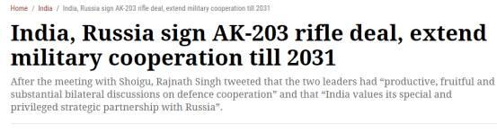 報道稱,印度防長拉傑納特·辛格6日會見了俄羅斯防長謝爾蓋·紹伊古,雙方簽署了在印度北方邦阿米西合資生產近60萬支AK-203突擊步槍的合同。這筆交易價值超過500億盧比(約6.63億美元)。此外,還簽署一項將軍事技術合作延長十年的協議,即從2021年到2031年。