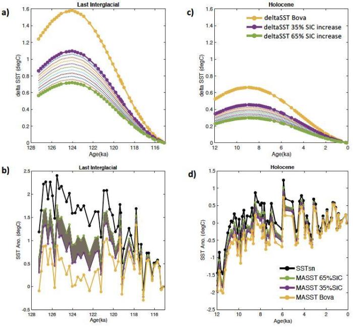 美國新澤西州立大學博瓦(Bova)博士等人之前在《自然》發文,他們假設距現代間冰期最近的上一個温暖的末次間冰期(距今約12.8-11.5萬年)不存在冰量和温室氣體變化,其全球温度的季節差異完全由不同季節的太陽輻射決定,並通過建立季節到年均温度的轉換函數(SAT),嘗試剔除古海温指標中的季節性偏差,以此定量年均温的變化,最終得出全新世以來,全球年均温呈線性升高趨勢的結論,驗證此前氣候模擬的結果。此文發表後學界高度關注,《自然》專題報道中認為,“全新世温度謎題”或已被解決。
