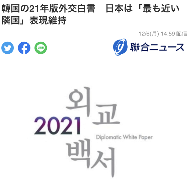 韓聯社:韓國2021年版外交白皮書,繼續將日本描述為“最近的鄰國”