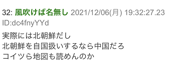 “實際上是朝鮮吧,就算把朝鮮當成自國,那也應該是中國,這幫傢伙連地圖都不會看嗎?”