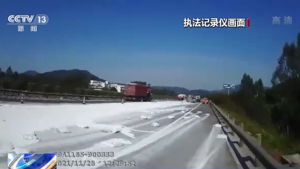 由於膩子粉在路面撒落範圍較廣,公路養護部門足足用了五個小時,道路才恢復通行。