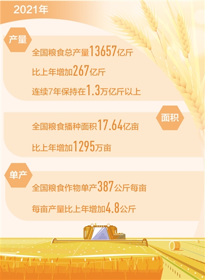 王明華説,2021年,雖然河南等地極端強降雨引發洪澇災害,西北陝甘寧局部地區階段性乾旱,秋收時期華北和黃淮海地區出現連陰雨天氣,對部分地區秋糧產生一定影響,但全國主要農區大部分時段光温水匹配良好,氣象條件總體有利於糧食作物生長發育和產量形成。2021年,夏糧和早稻產量分別為2919億斤和560億斤,分別比上年增加62億斤和14億斤;秋糧產量10178億斤,比上年增加191億斤。