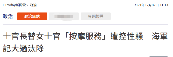 台媒:台海軍士官長為女士官“做按摩”被指控性騷擾,台軍方記大過並將其開除