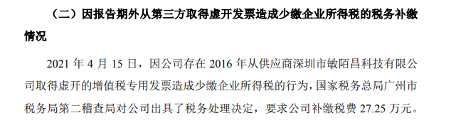 招股書披露,2021年4月15日,因公司存在2016年從供應商深圳市敏陌昌科技有限公司取得虛開的增值税專用發票造成少繳企業所得税的行為,國家税務總局廣州市税務局第二稽查局對公司出具了税務處理決定,要求公司補繳税費27.25萬元。