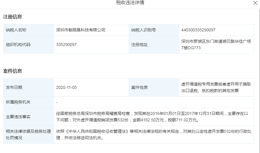 據此披露,深圳市敏陌昌科技有限公司為思林傑的供應商。但經國家税務總局深圳市税務局稽查局檢查,深圳市敏陌昌科技有限公司在2016年01月01日至2017年12月31日期間,對外虛開增值税銷項發票532份,金額4182.50萬元,税額711.02萬元。
