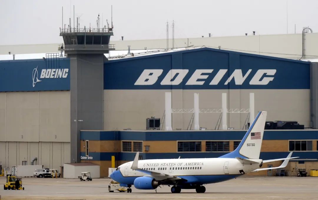 2011年2月25日,在美國堪薩斯的麥康奈爾空軍基地,一架美國政府的飛機經過波音公司大樓。新華社/EPA歐新