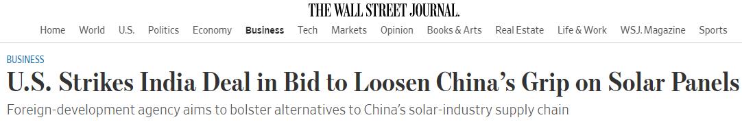 接下來報道提到了美國要搞所謂“聯印抗中”。《華爾街日報》稱,“第一太陽能”公司工廠生產的大部分產品將供應印度國內市場,“拜登政府認為印度是一個越來越重要的盟友,與印度合作也有助於美國對抗中國。”報道稱,印度太陽能裝機目標的力度在全球居前,該國政府力爭到2030年要將裝機容量提高至現有水平的3倍左右。