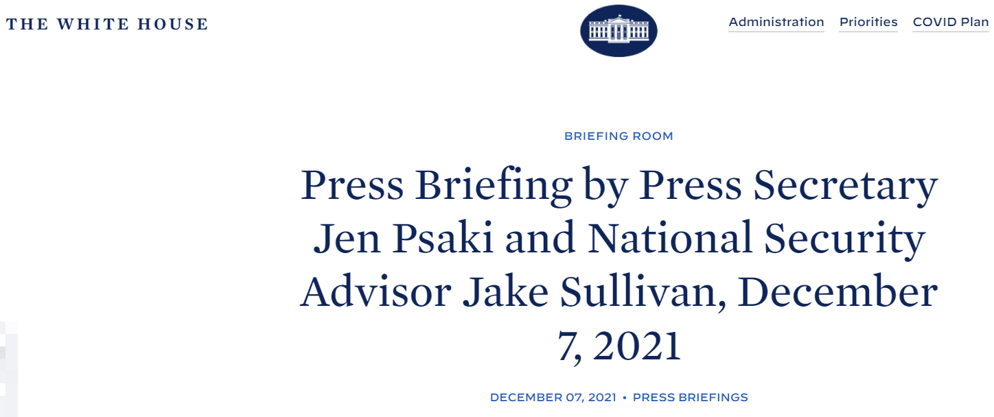 在接下來的問答環節中,記者們先是就所謂俄羅斯如果“入侵”烏克蘭、俄烏邊境局勢進一步緊張,以及俄美外交使團的問題向沙利文提問,沙利文回應的基調基本上和拜登的説法相同。