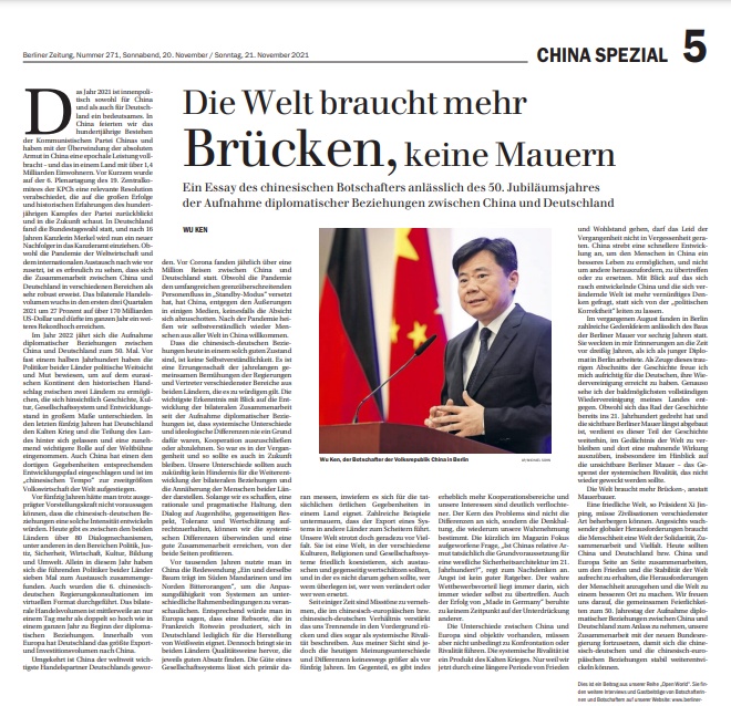 11月20日,德國《柏林報》(Berliner Zeitung)刊登吳懇大使署名文章《世界需要更多的“建橋者”而不是“建牆者”》,全文如下: