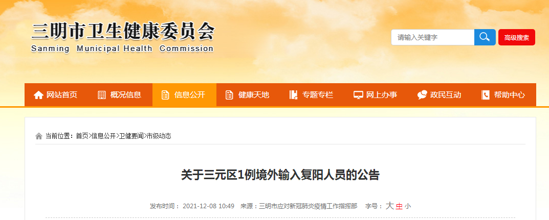2021年12月8日6:00,三元區報告1例境外輸入復陽人員,經專家組診斷為新型冠狀病毒感染(輕型)治癒後復陽人員(境外輸入性),現將情況公告如下: