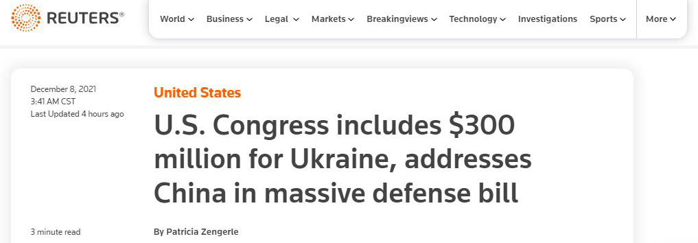 報道注意到,今年的美國國防授權法案草案是在美國總統拜登和俄羅斯總統普京進行視頻會晤後不久公佈的。在涉及中國方面,該草案包含了為“太平洋威懾計劃”提供71億美元資金,以及美國國會所謂“支持台灣防禦”的聲明。
