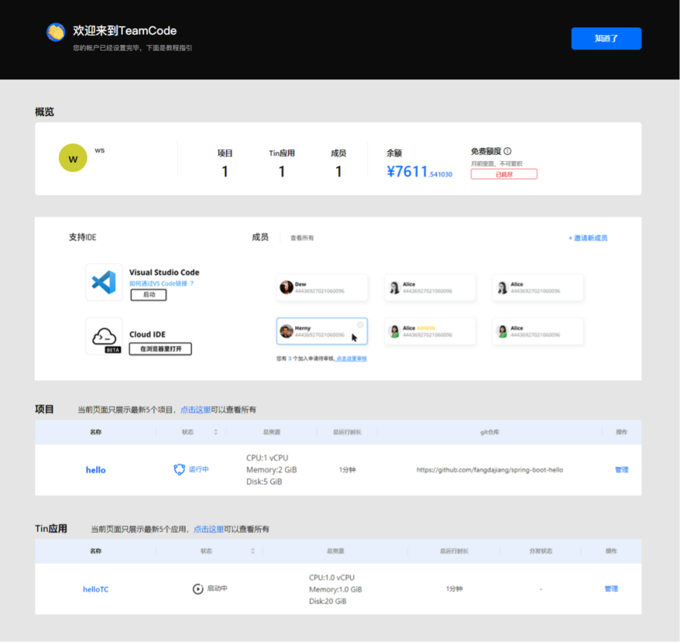 在開發者應用場景的規劃設計中,TeamCode獨創產品Tin,主打一鍵POC、自動配置項目運行環境,幫助企業快速進行技術選型、產品POC驗證,讓分佈式應用、中間件可以直接使用,免去繁瑣依賴安裝環節,降低開發者學習和使用門檻,幫助項目快速推廣。目前已經有多家企業及項目通過Tin進行高速推廣。
