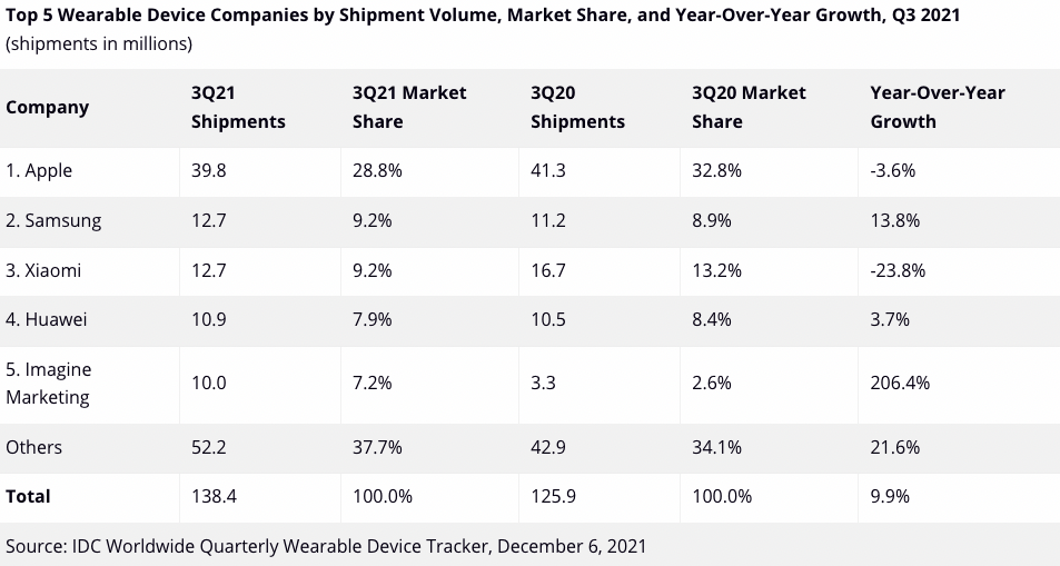 由於供應不足的問題,蘋果不得不將其Watch Series 7的發售推遲到了第四季度,從而導致其出貨下降了 35.5%。但是蘋果仍保持在第一的位置,其佔據了整個市場超過53%的美元價值。2021年第三季度蘋果可穿戴設備出貨3980萬台,市場佔比28.8%。