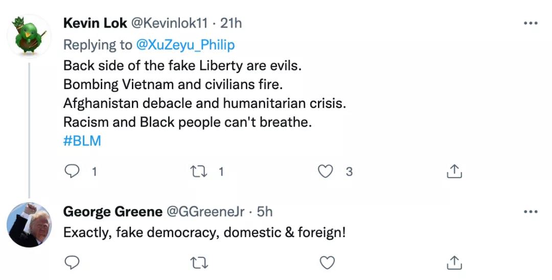 另一個網友立刻回覆道:“説的沒錯,就是假民主,無論在美國國內還是國外都一樣。”
