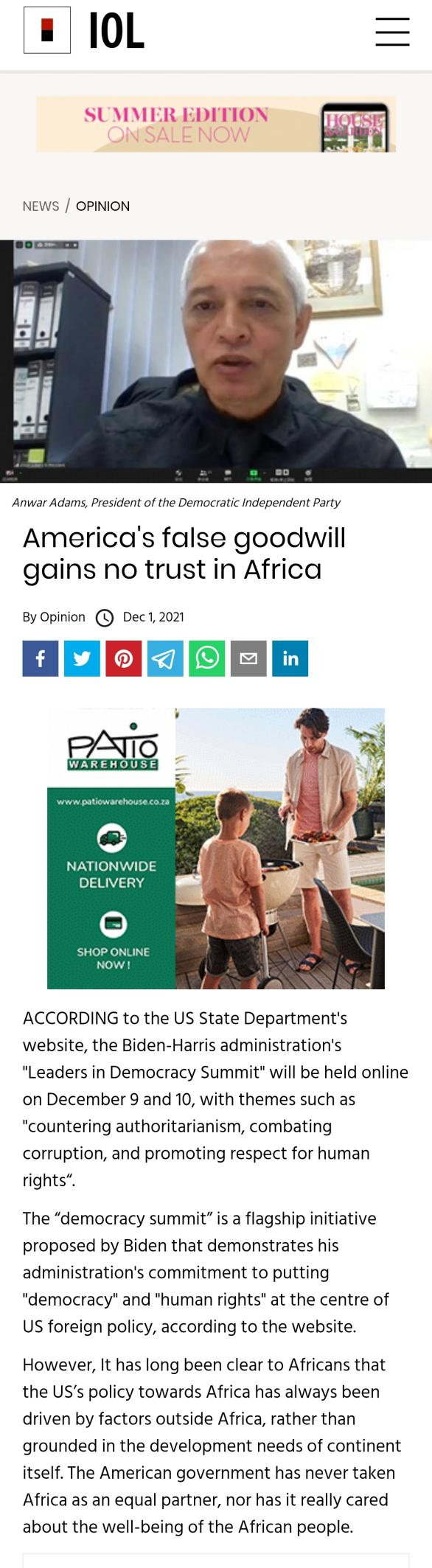 △南非民主獨立黨領導人安瓦爾·亞當斯12月1日在獨立傳媒網站發表評論《美國虛假的善意在非洲得不到信任》