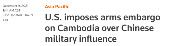 【環球網報道 記者 烏元春】據路透社報道,美國當地時間8日對柬埔寨實施武器禁運和新的出口限制,理由是美方所稱的“中國對柬埔寨日益增強的軍事影響力”以及柬埔寨國內存在所謂“人權”和“腐敗”問題。