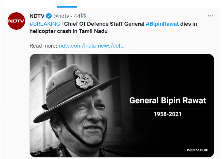 印軍最高將領拉瓦特等13人墜機身亡,消息人士:可能是大霧造成能見度低導致