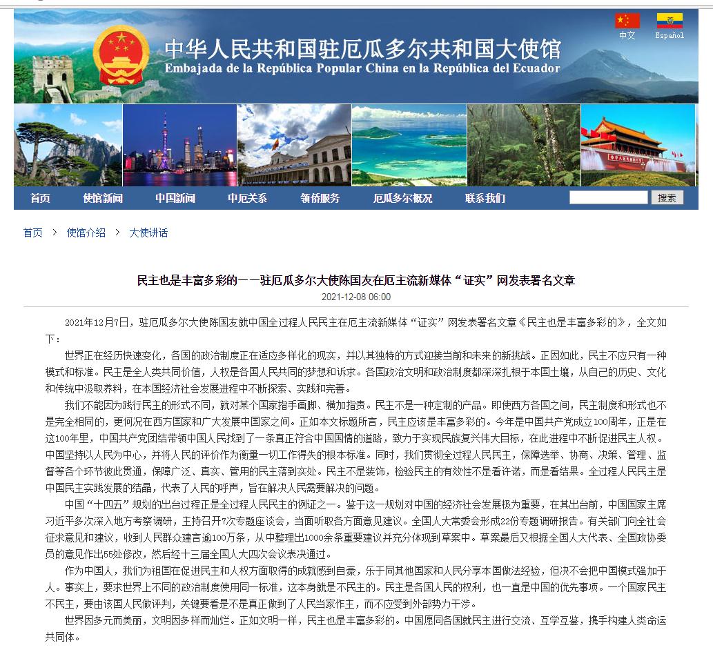 2021年12月7日,駐厄瓜多爾大使陳國友就中國全過程人民民主在厄主流新媒體“證實”網發表署名文章《民主也是豐富多彩的》,全文如下: