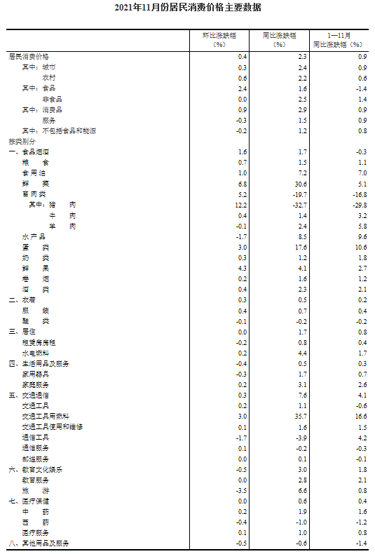 【數據發佈】2021年11月份居民消費價格同比上漲2.3% 環比上漲0.4%