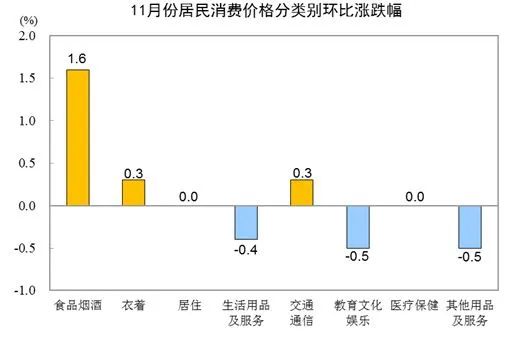 11月份,食品煙酒類價格同比上漲1.7%,影響CPI(居民消費價格指數)上漲約0.49個百分點。食品中,鮮菜價格上漲30.6%,影響CPI上漲約0.60個百分點;蛋類價格上漲17.6%,影響CPI上漲約0.10個百分點;水產品價格上漲8.5%,影響CPI上漲約0.15個百分點;鮮果價格上漲4.1%,影響CPI上漲約0.07個百分點;糧食價格上漲1.5%,影響CPI上漲約0.03個百分點;畜肉類價格下降19.7%,影響CPI下降約0.81個百分點,其中豬肉價格下降32.7%,影響CPI下降約0.68個百分點。