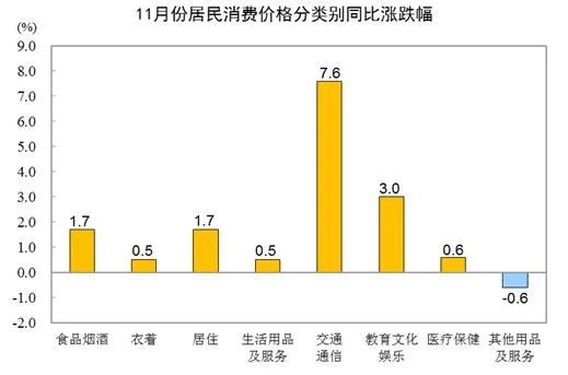 其他七大類價格同比六漲一降。其中,交通通信、教育文化娛樂、居住價格分別上漲7.6%、3.0%和1.7%,醫療保健、衣着、生活用品及服務價格分別上漲0.6%、0.5%和0.5%;其他用品及服務價格下降0.6%。