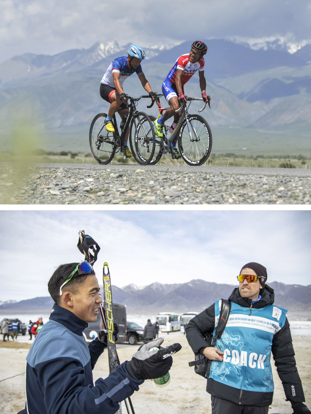 ↑拼版照片:上圖為吐爾松江·布爾力克(右)和自己的師傅趙勇在温泉縣的一處鄉村公路上練習備賽(2017年5月29日攝);下圖為吐爾松江·布爾力克(左)和越野滑雪國家集訓隊教練巴赫交流訓練情況(2021年11月22日攝)。