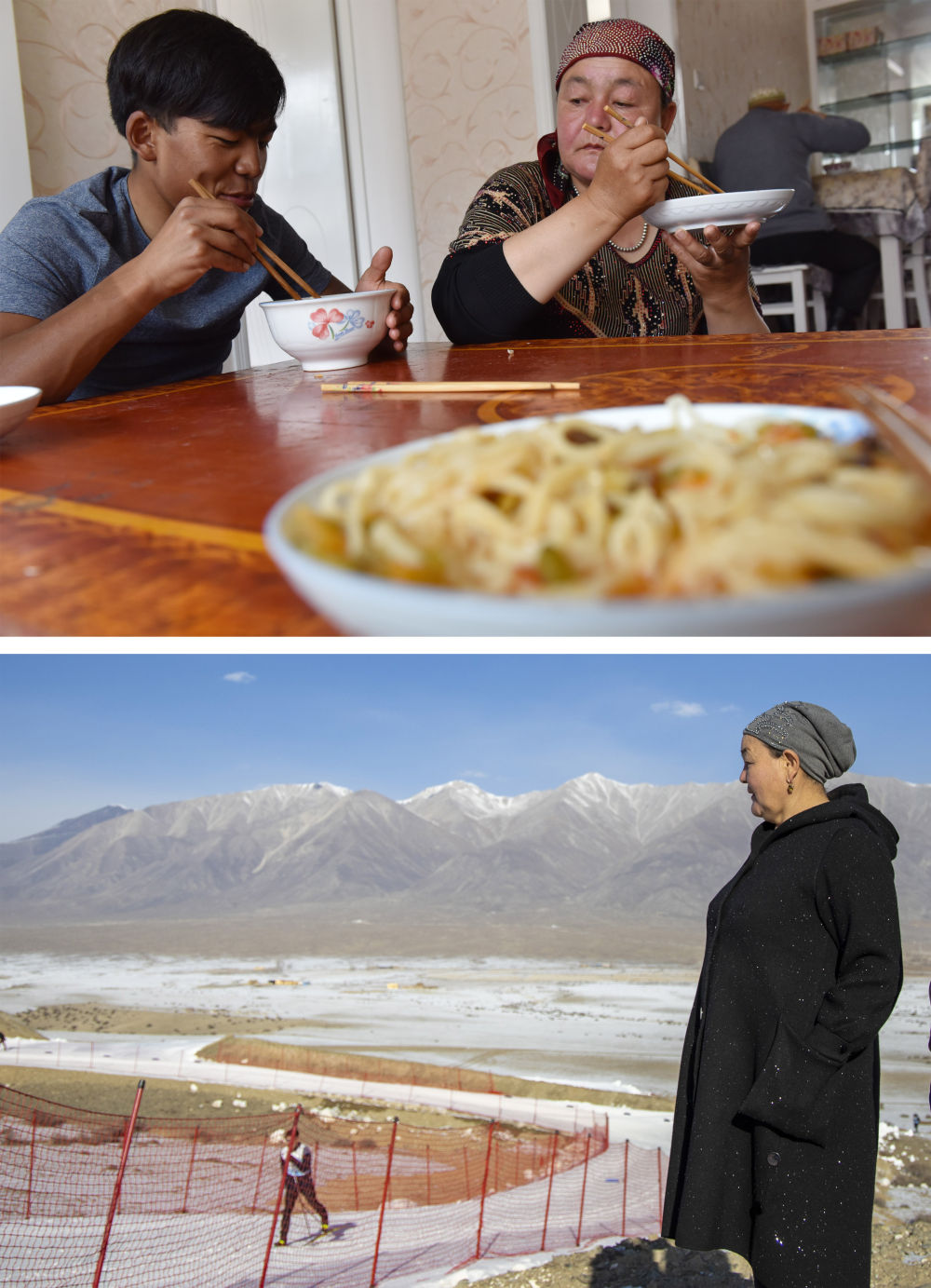 ↑拼版照片:上圖為第十一屆環賽里木湖公路自行車賽前,吐爾松江·布爾力克和母親在家中吃飯(2017年5月29日攝)。此前在家備戰自行車賽時,有時一天四頓,都是母親負責;下圖為吐爾松江·布爾力克的母親在温泉縣越野滑雪場的山上觀看兒子比賽(2021年11月23日攝)。