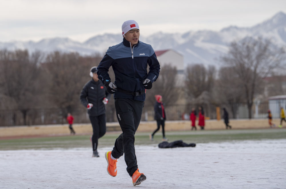 ↑這是完成當日的積分賽後,吐爾松江·布爾力克和越野滑雪國家集訓隊隊友在温泉縣體育場放鬆跑步(2021年11月22日攝)。