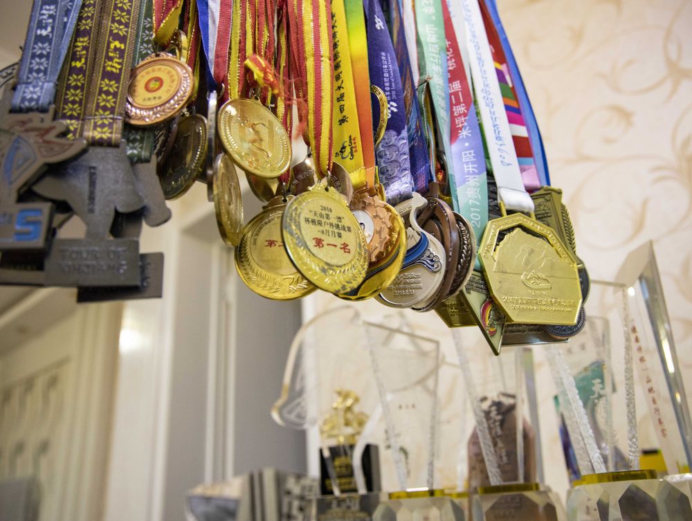 ↑這是在吐爾松江·布爾力克家中拍攝的他曾經獲得的自行車賽等賽事獎牌和獎盃(2021年11月25日攝)。