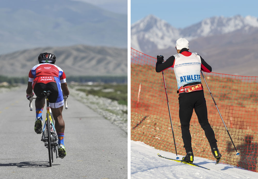 ↑拼版照片:上圖為第十一屆環賽里木湖公路自行車賽前,吐爾松江·布爾力克在温泉縣的一處鄉村公路上練習(2017年5月29日攝);下圖為吐爾松江·布爾力克 隨越野滑雪國家集訓隊在新疆温泉縣越野滑雪場訓練(2021年11月25日攝)。