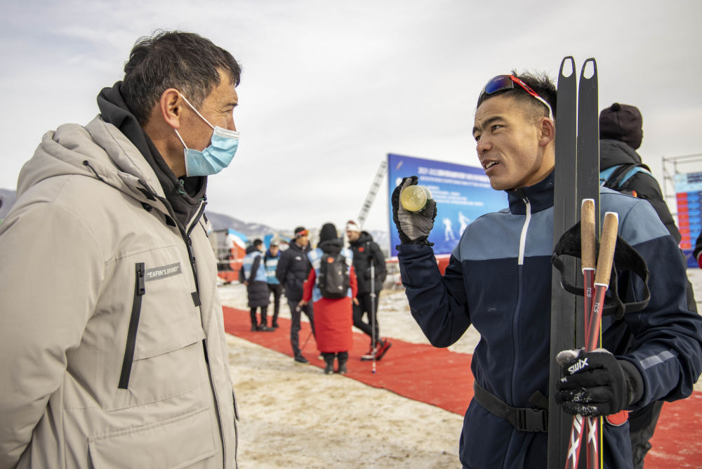 ↑這是一次訓練結束後,在温泉縣越野滑雪,吐爾松江·布爾力克(右)和體育啓蒙老師阿布都沙拉木·賽買提交流(2021年11月22日攝)。這次回鄉訓練比賽,吐爾松江吸引了家鄉父老的目光。
